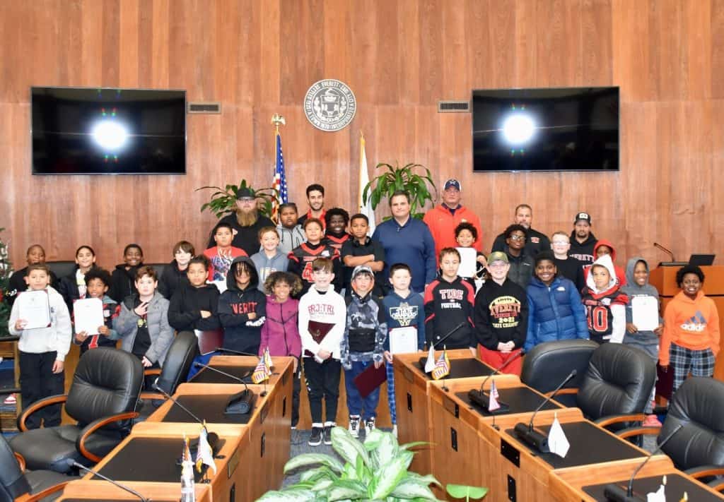 At Everett City Hall, Mayor Carlo DeMaria recently congratulated the Crimson Tide Pop Warner 10U team on going undefeated all season to win the 10U Northeastern Regional Pop Warner championship in November. This accomplishment granted them the opportunity to travel to Florida to compete in what is often a once-in-a-lifetime opportunity for the Pop Warner National Championship. The team fell short of acquiring the championship, but that didn’t take away from the success of their season.