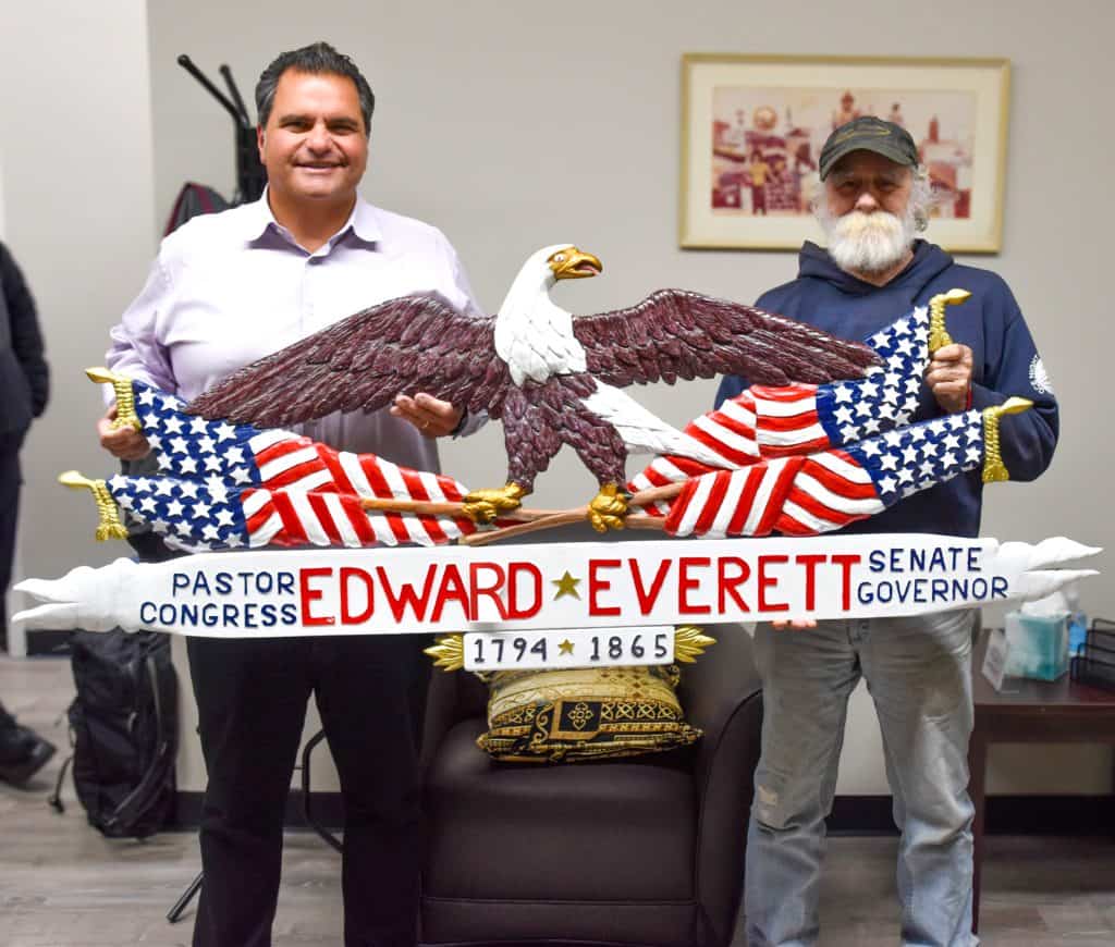 Mayor Carlo DeMaria is pleased to recognize Everett resident Gerald Frew for his generous donation of a specially crafted plaque to the City of Everett. Frew personally designed and created the plaque in memory of Edward Everett, the city’s namesake, to honor his lifelong dedication to public service. The plaque highlights Everett’s distinguished career, including his roles as a pastor, U.S. Representative, U.S. Senator and the 15th Governor of Massachusetts.