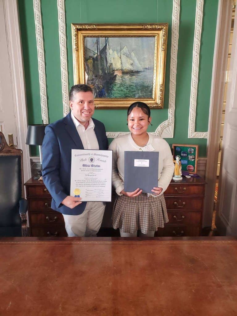 Last week Senator Sal DiDomenico recognized an Everett High School student, Mia Allen, at the State House’s Student Government Day with a Citation and took her on a brief tour of the building. DiDomenico also brought Mia into Governor Maura Healey’s office and discussed the history of leaders who have worked in that office. Student Government Day is a great opportunity for high school students from all parts of the state to visit the State House for a day of education and debating real legislation.