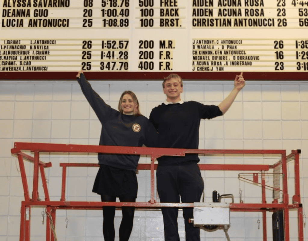 The girls 200-yard medley relay team of Isabella Cirame, Lucia Antonucci, Isabelle Pennachio and Britney Nayiga set a new school record with a time of 1:52.57. The quartet surpassed the previous mark of 1:53.01, which had been set at the 2025 state championship by Sydney Cao, Isabelle Pennachio, Lana Albuquerque and Britney Nayiga. Senior Britney Nayiga also broke her own school record in the girls 50 freestyle, touching the wall in 25.30 and lowering the mark she established in 2025.