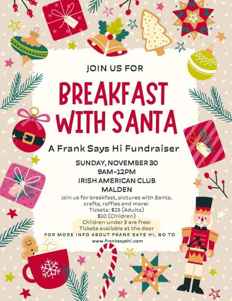 So yes, Maldonians, it’s that time again. A fundraiser, sure, but really it’s a celebration of a kid from Thacher Street who never stopped saying “Hi” to the world — and a city that refuses to stop saying it back. Once again, this year the annual “Frank Says High” fundraiser will be “Breakfast with Santa”! The event will take place on Sunday, November 30, from 9 a.m. to 12 p.m. at the Irish American Club in Malden. Henry’s Catering will be providing one of their fabulous breakfasts. There will be pictures with Santa, arts and crafts for children, tons of raffle prizes and more! Tickets are available at the door:- $25 for adults and $10 for kids; children under three, free. For more info go to http://www.franksayshi.com.