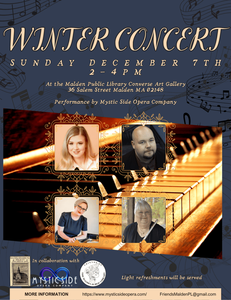 Sunday, December 7, 2-4 p.m.: Winter Holiday Concert at the Malden Public Library. In collaboration with the Malden Historical Society, join us for our Winter Holiday Concert in the historical Converse Art Gallery! Enjoy beautiful performances from Mystic Side Opera Company along with light refreshment at this free event. We are looking for volunteers to help set up, usher, serve refreshments and clean up. Reach out if you would like to volunteer.