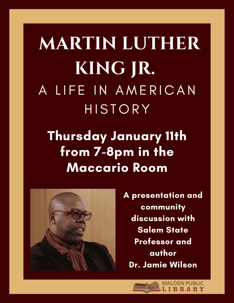A presentation and community discussion with Salem State Professor and author Jamie Wilson on Thursday, Jan. 11, from 7-8 p.m. at the Malden Public Library