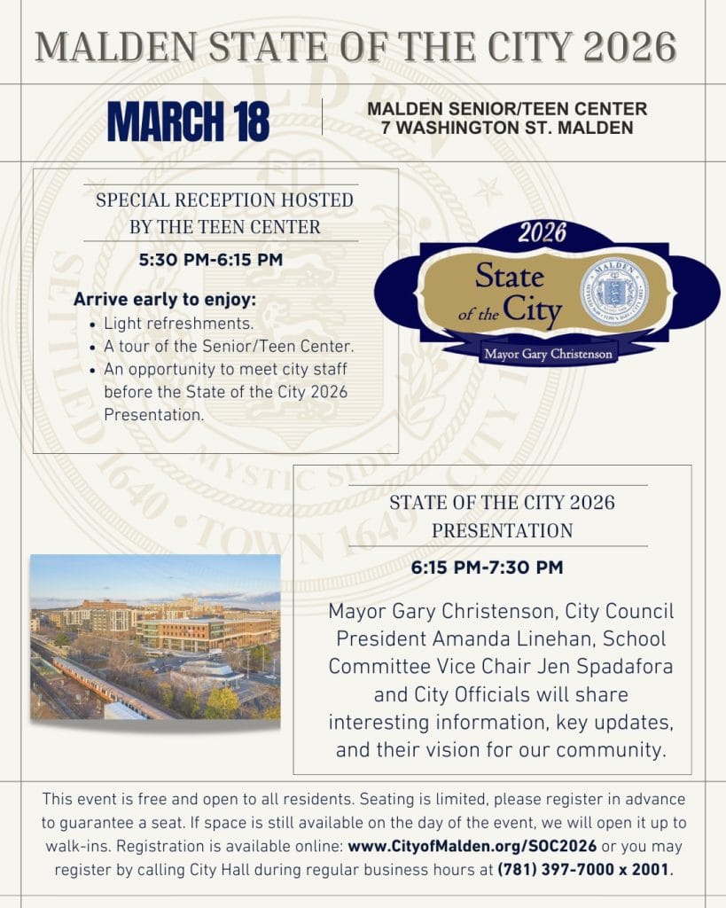 Mayor Gary Christenson invites residents to attend Malden’s 2026 State of the City on Wednesday, March 18, at the Senior/Teen Center (7 Washington St.). This year the event is taking a new approach, with a special reception hosted by Malden teens prior to the official presentation. Residents are encouraged to arrive at 5:30 p.m. to enjoy light refreshments, tour the Senior/Teen Center and meet City of Malden staff before the presentation begins. The State of the City presentation will start at 6:15 p.m., with Mayor Gary Christenson, City Council President Amanda Linehan (Ward 3) and other city officials sharing updates, key information and their vision for the community.