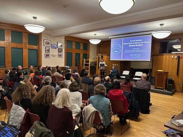 Malden parent Shaleen Title, a volunteer with Reconnect Malden, helped bring this event to the MPL after having conversations with other local parents about technology and kids. “We were exhausted with decisions about phones, social media, and AI; we were concerned about all of the software being used at school; and we felt like we were dealing with all of this alone,” she explained. She helped organize this event “to bring us together and empower us to deal with these topics together.”