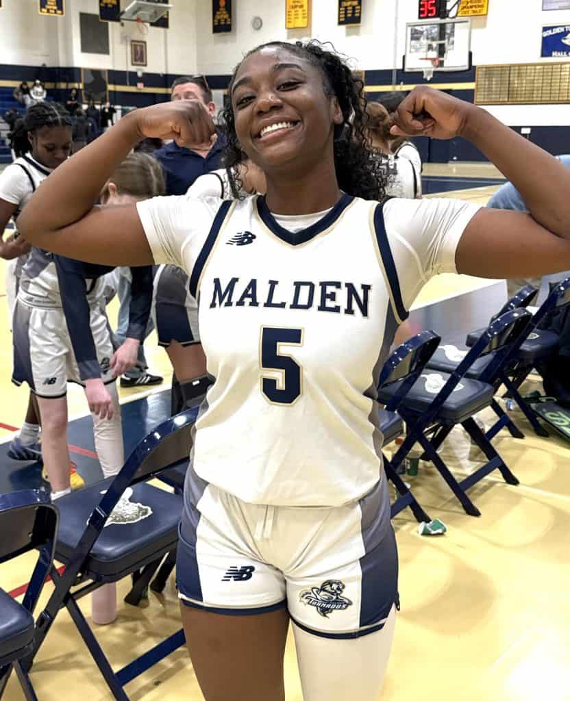 Along with Exilhomme’s banner night, it was also a solid team win, with Malden teammate Jazairra Antoine chipping in with another “double-double”: 12 points and 14 rebounds. Senior Madison “Maddie” Cook also had a solid game for Malden with her defense, rebounding and passing contributions.