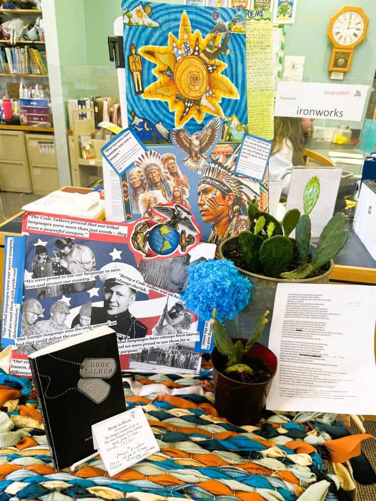 Myra Monto and her seventh-grade class at Saugus Middle School chose “Code Talker” by Joseph Bruchac to feature. The book tells the story of how Navajo Marines used their native language to create an unbreakable code during World War II. The class read the book, discussed its theme of identity and all contributed ideas for the arrangement, Monto said.