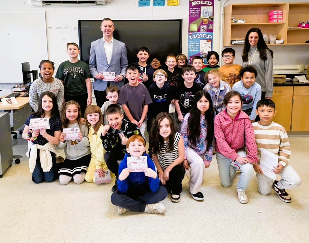 Fiorella Moreira had to be the most popular third-grader at Belmonte STEAM Academy last week – at least among the students in Jennifer Nicolo’s third-grade class. Mrs. Nicolo’s class was one of many throughout the area participating in state Sen. Brendan P. Crighton’s (D-Lynn) annual holiday card contest, and Fiorella’s drawing wound up winning. Crighton made it the cover of his holiday card, which went out to more than 1,000 recipients.