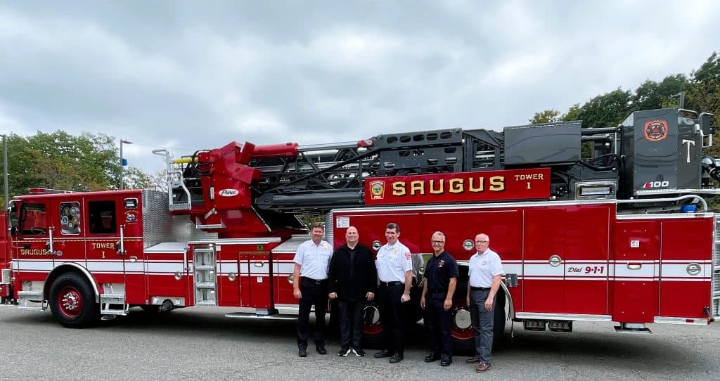 Town Manager Scott C. Crabtree and Fire Chief Michael Newbury are thrilled to announce the arrival of a state-of-the-art tower (ladder) fire apparatus that will significantly improve the Saugus Fire Department’s ability to safely respond to emergencies and provide a major benefit to residents for years to come. The tower fire apparatus, called Tower 1, is a specialized vehicle that comes equipped with a bucket at the end of its boon that can be raised to 100 feet and allows firefighters to safely handle rescue operations at great heights. The Tower 1 bucket can be lowered or extended out horizontally to assist firefighters with water rescues and other emergency responses. The vehicle also boasts T3 rear steering that offers increased maneuverability and a better turning radius in tight spaces, a backup camera, and numerous enhanced public safety features.