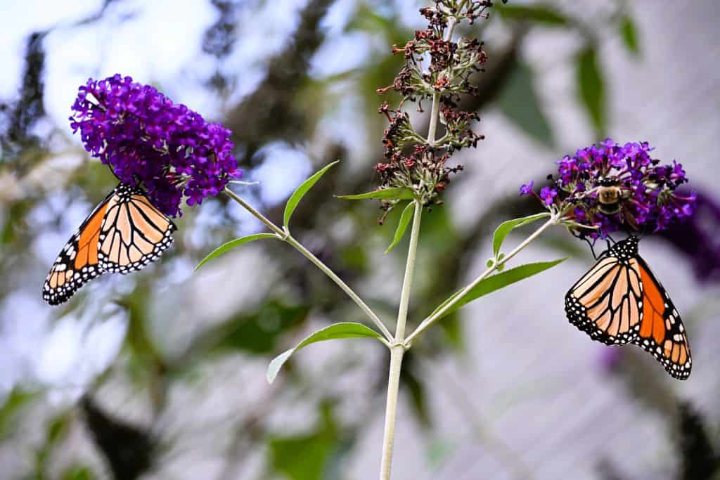 Monarch butterflies (Danaus plexippus) were slow to arrive this summer, but I have been seeing them just about every day for the past month or more. On Monday, there were 14 at once in my butterfly bush (Buddleia davidii), which blooms in a sunny area near Fairmount Avenue. The fragrant flowers attract quite a few different butterflies, bees and other pollinators. Since I have a few species of milkweed growing nearby, the butterflies would also have the plants they need for laying eggs.