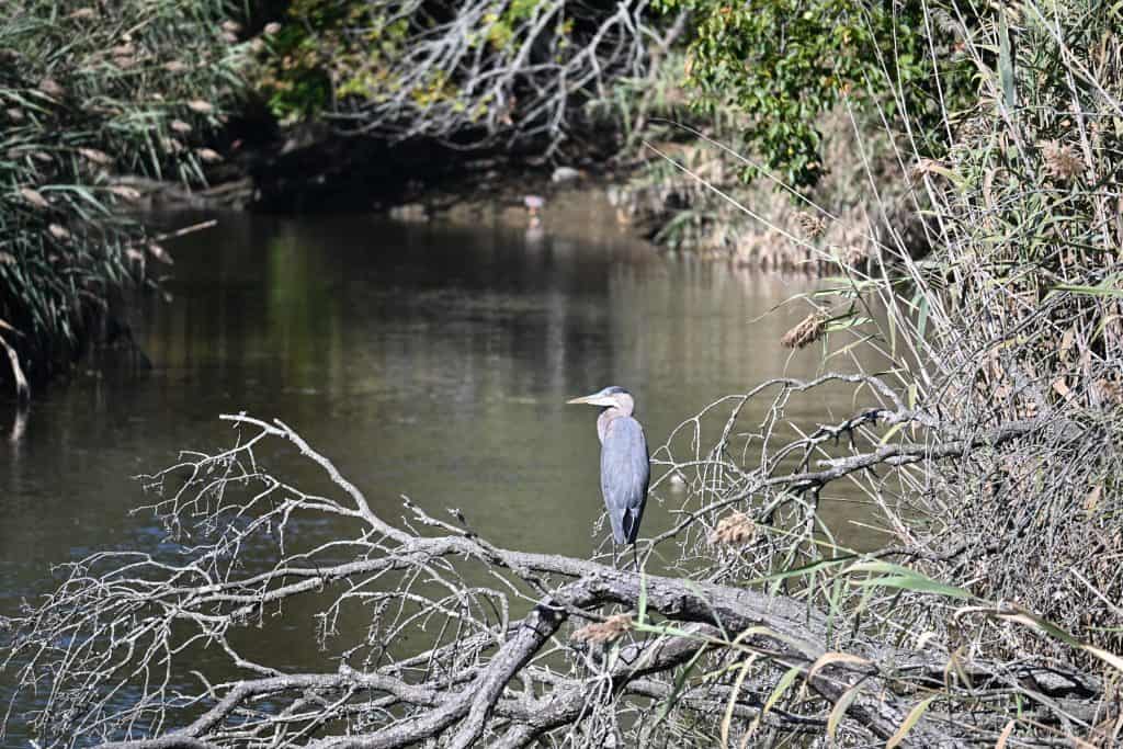 The great blue heron (Ardea herodias) is a wading bird that often visits places along the Saugus River to fish, especially when the tide is fairly low, making it easy to see and catch its prey in the shallow water. One of the favorite perches for herons is on a branch extending over the river near Hamilton Street, viewable from the sidewalk at the bridge. I have seen it on this spot several times in the past few weeks.