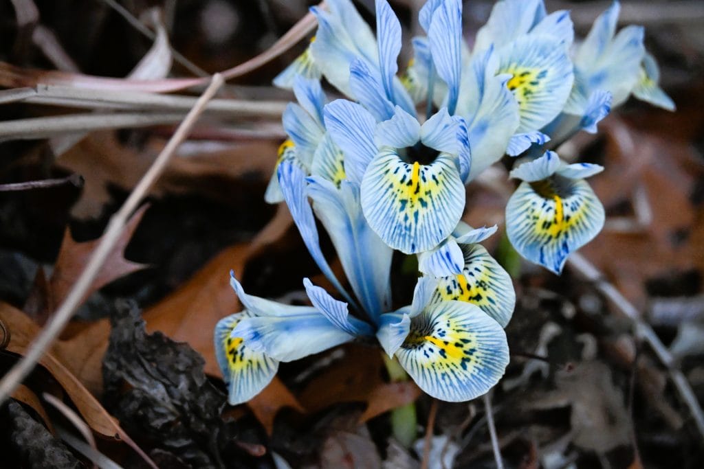 Among the early bulbs blooming now is the tiny ‘Katharine Hodgkin’ iris (Iris reticulata ‘Katharine Hodgkin’), which has light blue-veined tepals with yellow and dark blue speckled nectar guides. When I headed out Saturday morning, I predicted that the flowers would be open by the time we returned home that evening, and indeed my prediction was accurate! While most people are more familiar with the bearded irises and flag irises that have much longer stems and larger flowers, these and other very early irises bloom from bulbs, and the flowers are just an inch or two above the ground surface. Like snowdrops, crocuses and other geophytes, they prefer a well-drained soil and become dormant a month or so after flowering. These little irises are resistant to deer and rabbits.