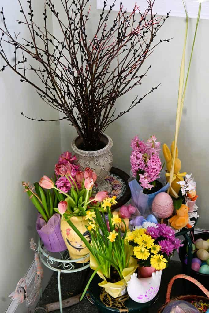For anyone feeling impatient for more showy flowers, there are potted bulbs that have been forced into bloom by being warmed up early, usually in a greenhouse or shipped up from warmer zones. Inspired by the early March flower bulb shows at Smith and Mt. Holyoke Colleges in the Pioneer Valley of Massachusetts, I gathered tables and step stools to arrange an Easter display on my indoor stairway landing. A bouquet of tall black pussy willows (Salix melanostachys) is surrounded by pots of pink oriental hyacinths (Hyacinth orientale), yellow tête-à-tête daffodils (Narcissus ‘Tête-à-Tête’), pastel mums (Chrysanthemum hortorum), an egg-shaped pot of miniature orchids, a bouquet of Darwin hybrid tulips (Tulipa hybrida) and an array of bunny, chicken and egg Easter decorations set a festive scene.
