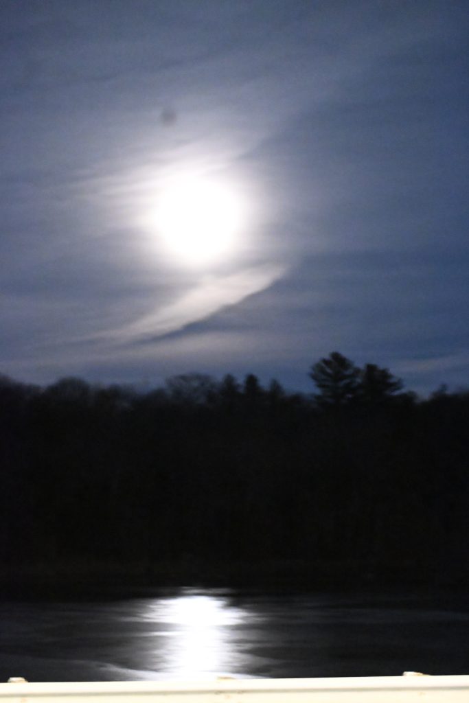 The cold moon was still very striking last week as it shone between clouds several evenings, including last Friday during the tree lighting. On Monday evening I was lucky to see a gleaming moon “glade” on Birch Pond, as the moon’s reflection cast a bright path over the surface of the water. Some sections of our ponds have begun to freeze, due to the cold temperatures of recent nights, while other areas still have some open water.