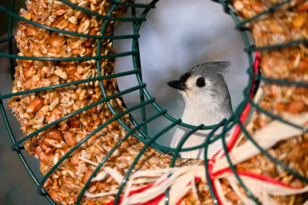 The cold weather means that the birds and some mammals need extra calories, so many people feed the birds during the winter. Seed wreaths are seasonal decorations that are popular, as they not only look festive but also feed the birds. The one my family put out for Christmas attracted quite a few different bird species, including a red-bellied woodpecker (Melanerpes carolinus) and a tufted titmouse (Baeolophus bicolor). I expect the woodpecker has a nest in a cavity in my silver maple (Acer saccharinum) trunk, since I often see it and its mate going up and down that tree, looking for insects. Both of these birds are regular visitors to my birdfeeders and remain in the neighborhood year-round. Northern cardinals (Cardinalis cardinale) also are attracted to these seeds but seem to prefer foraging on the ground under the feeders more often than actually perching on the feeders. I did find them clinging to the wreath once or twice, though, before it was devoured.