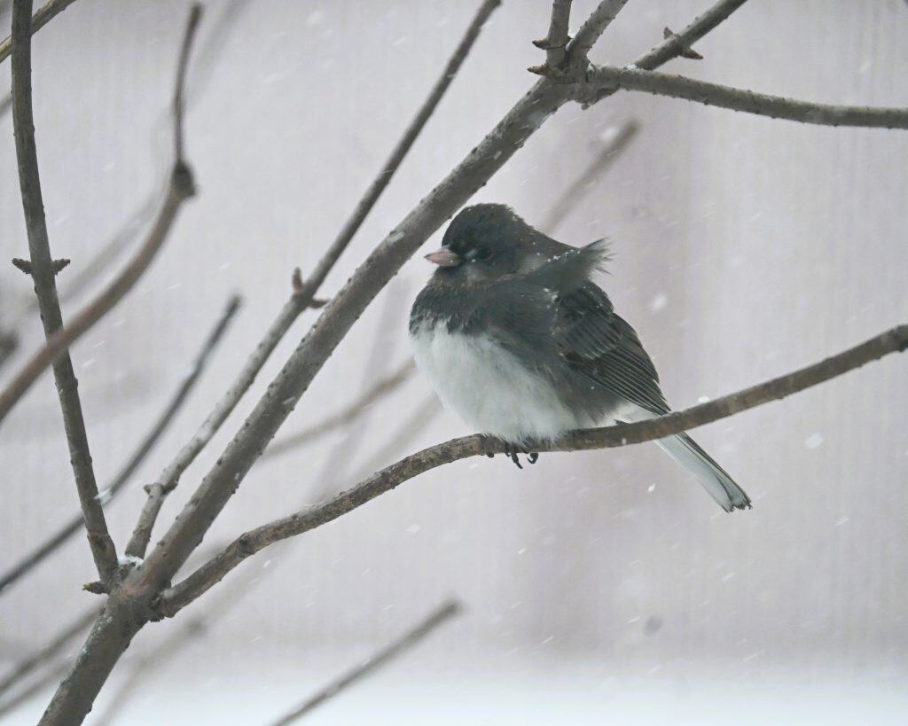 February 3 is Feed the Birds Day. The deep snow cover makes it difficult for birds to find some of their favorite foods, especially those who like to forage on the ground. Some bird foods like small fruits may be close to depleted as we get closer to spring or have become dry and shriveled, which could make them less appetizing. Very few insects are available. Birds and other wildlife need fatty foods to stay warm. Fluffing up their feathers, like the dark-eyed junco (Junco hyemalis) is doing above, helps increase their insulation value to keep the birds warm in cold temperatures. February 3 is halfway between the winter solstice and the spring equinox on March 20, so winter is halfway over!
