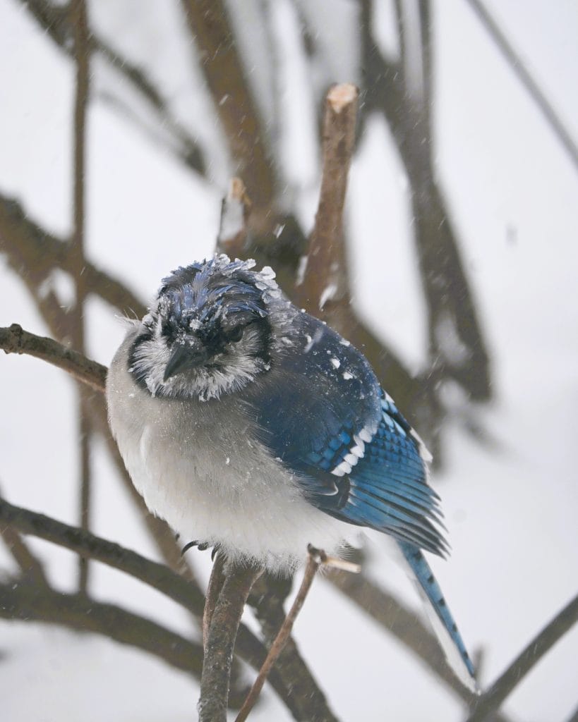 The weather has been rough on wildlife, as the deep snow makes it much more difficult for many animals to search for food or to escape predators. Over the weekend I saw a few birds of prey at the Saugus Iron Works: a turkey vulture (Cathartes aura) using the chimney as a lookout perch, and a hawk up in a tree somewhat farther away. On Monday, a red-shouldered hawk (Buteo lineatus) caught its lunch in my front yard and ate some of it before flying off with the rest to its nest. Several of the birds at my feeder kept shaking their heads during the storm as the snow got in their eyes, and all of the blue jays were having “bad feather days” from bits of ice entangled in their crest feathers. The jays kept rubbing their heads against tree branches to scrape the ice pellets off as they checked out their surroundings during the storm.