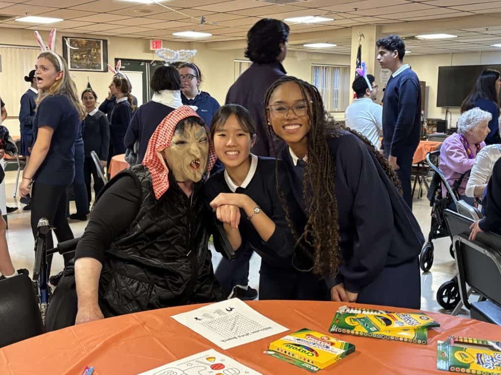 Both adults and youths were dressed to the hilt in their most creative costumes. Students provided face painting for residents and distributed Halloween-themed activity sheets. The youths were toilet-papered at “mummy stations” and played Bingo games called by the residents. The third-graders went around to tables manned by the residents and trick-or-treated at each one.
