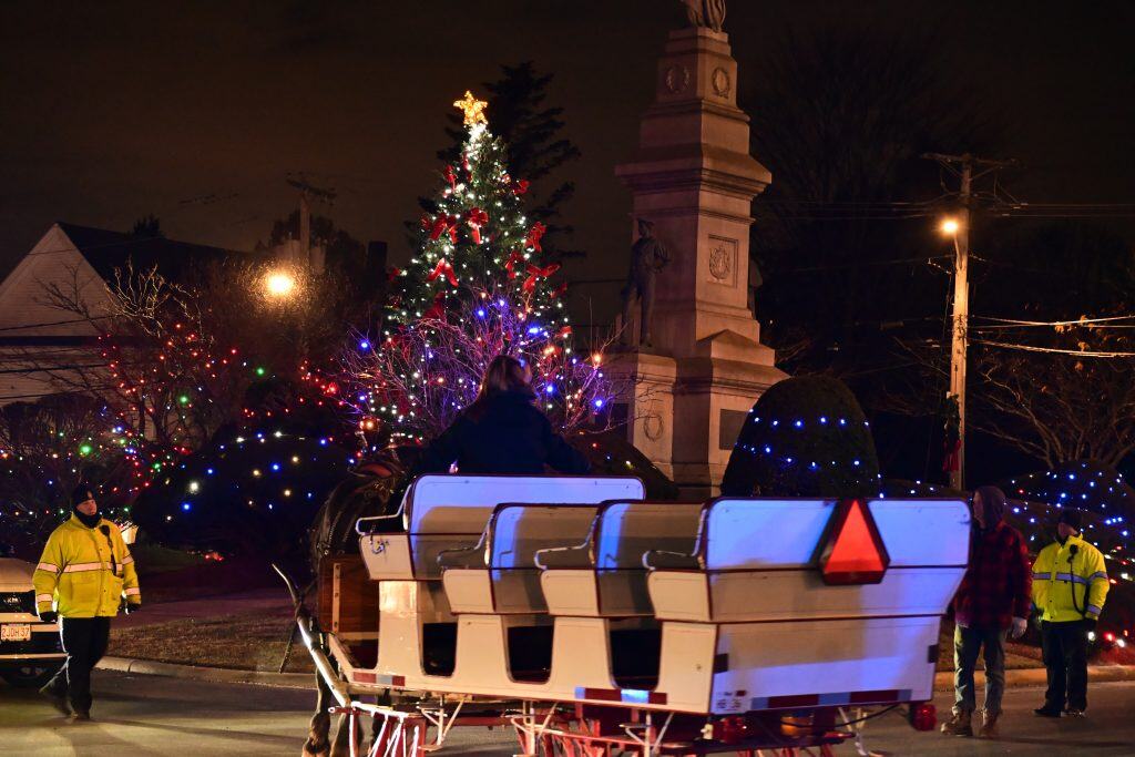 Despite the biting cold last Friday evening, the weather did not dampen the spirits of the crowd that gathered to see Santa flip the switch to turn on the Saugus Center lights. The event ran for several hours, during which time visitors could admire the many decorations, including teddy bears, penguins, a fire engine and much more, around the Town Hall lawn and the library grounds. The ever-popular petting zoo – this year’s edition from Enchanted Animal Parties of Groton, Mass. – entertained children of all ages, with sheep, chickens, goats, a llama and other animals under a small tent beside Hamilton Street. People could warm up and browse the fair at the Congregational Church during the evening. At 7 p.m., the guest of honor, Santa Claus of course, was escorted to Town Hall by a police car, and he himself rode in style in a sleigh-style carriage pulled by a pair of horses.