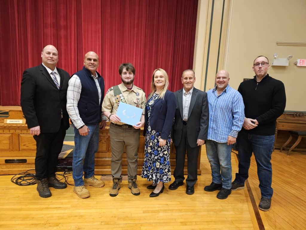 Board of Selectmen Chair Debra Panetta: “[The Eagle badge] shows strong leadership and a deep tie to our community. And we want to thank you. We’re very proud of everything you’ve done. Being an Eagle Scout is going to help you get into college. It’s going to help you with your jobs. My son got his Eagle back 12 years ago and he still leaves it on his resume. He’s so very proud.”