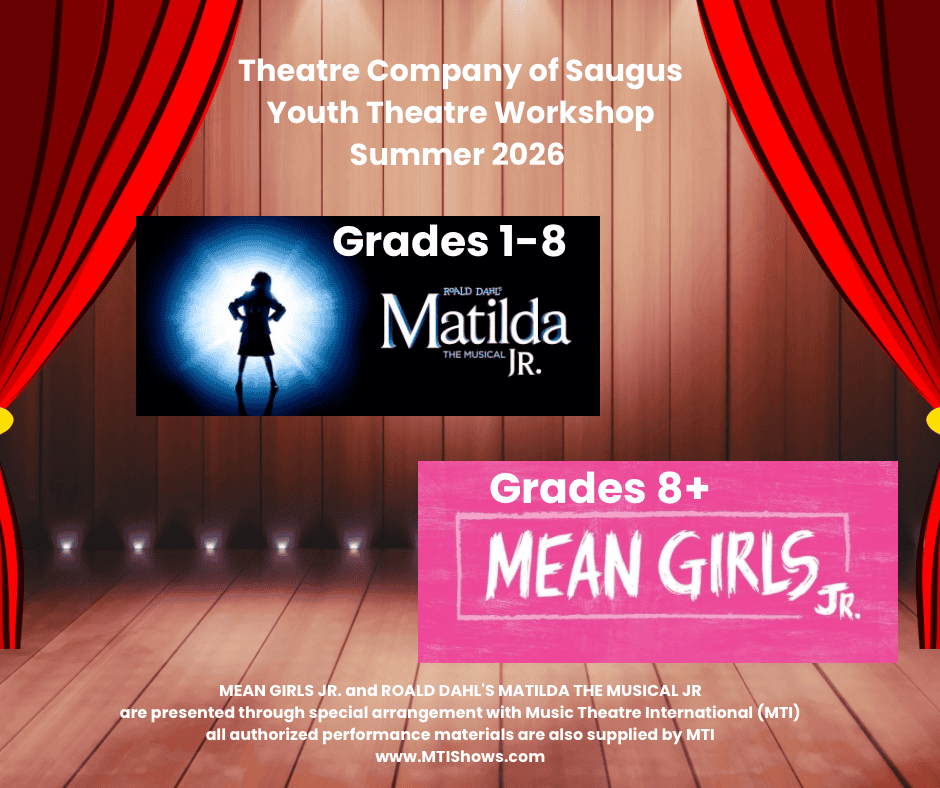 Theatre Company of Saugus (TCS) is excited to announce that Early Bird Registration is now open for the Summer 2026 Youth Theatre Workshops. NOTE: Early Bird Registration is a discounted rate that applies through May 25, 2026; registered and paid in full by Monday, May 25 = $500.00. Registered and/or payment received after Monday, May 25 = $550.00. Multi-Child Rate = email us for more information.