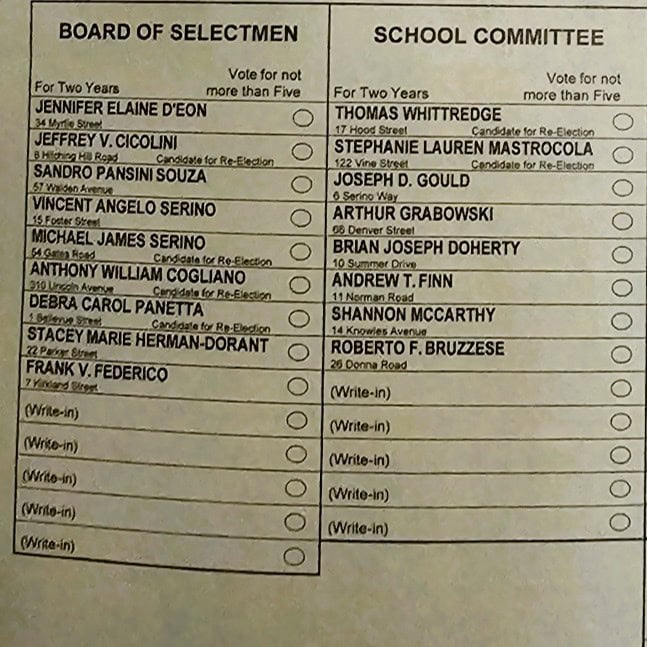 - A major turnover in the School Committee race, which will result in at least three new members being elected to the committee – as three members decided not to seek another term. Veteran committee members John Hatch and Ryan Fisher stepped down, while School Committee Chair Vincent Serino decided to run for selectman instead of another term on the School Committee. (Please see the last story in a series of candidate questions and answers. Seven of the eight candidates shared their views on how to improve the operation of town government.)